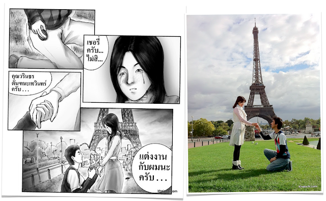 อันนี้หลายคนน่าจะเห็นกันบ้างแล้ว คือในตอนท้ายของการ์ตูนจะมีฉากที่เอ็มไปขอเชอรี่แต่งงาน ซึ่งมุม แสง ท่าทางทั้งหมด นั้นก็มาจากรูปและวิดีโอที่มีอยู่จริง