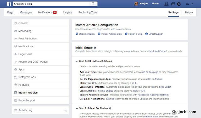 - ถ้าติดตั้งเรียบร้อย จะเห็นว่ามีเมนูชื่อ Instant Articles ขึ้นมาด้านซ้าย