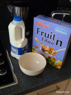 7.45 – ข้าวเช้า ต้องทำกินเอง เพราะไม่มีแซนด์วิชหมูหยองพริกเผาชิ้นละ 20 บาทเหมือนบ้านเรา .. อาหารเช้าส่วนใหญ่ก็จะเป็นคอนเฟลกส์กับนม แล้วก็มีขนมปังทาเนย+แยม ผลไม้ก็กินกล้วยเป็นหลักเพราะง่าย ไว เก็บได้นาน .. ซึ่งทั้งหมดก็จะซื้อตุนเอาไว้อาทิตย์ละครั้ง