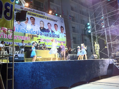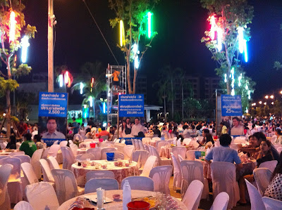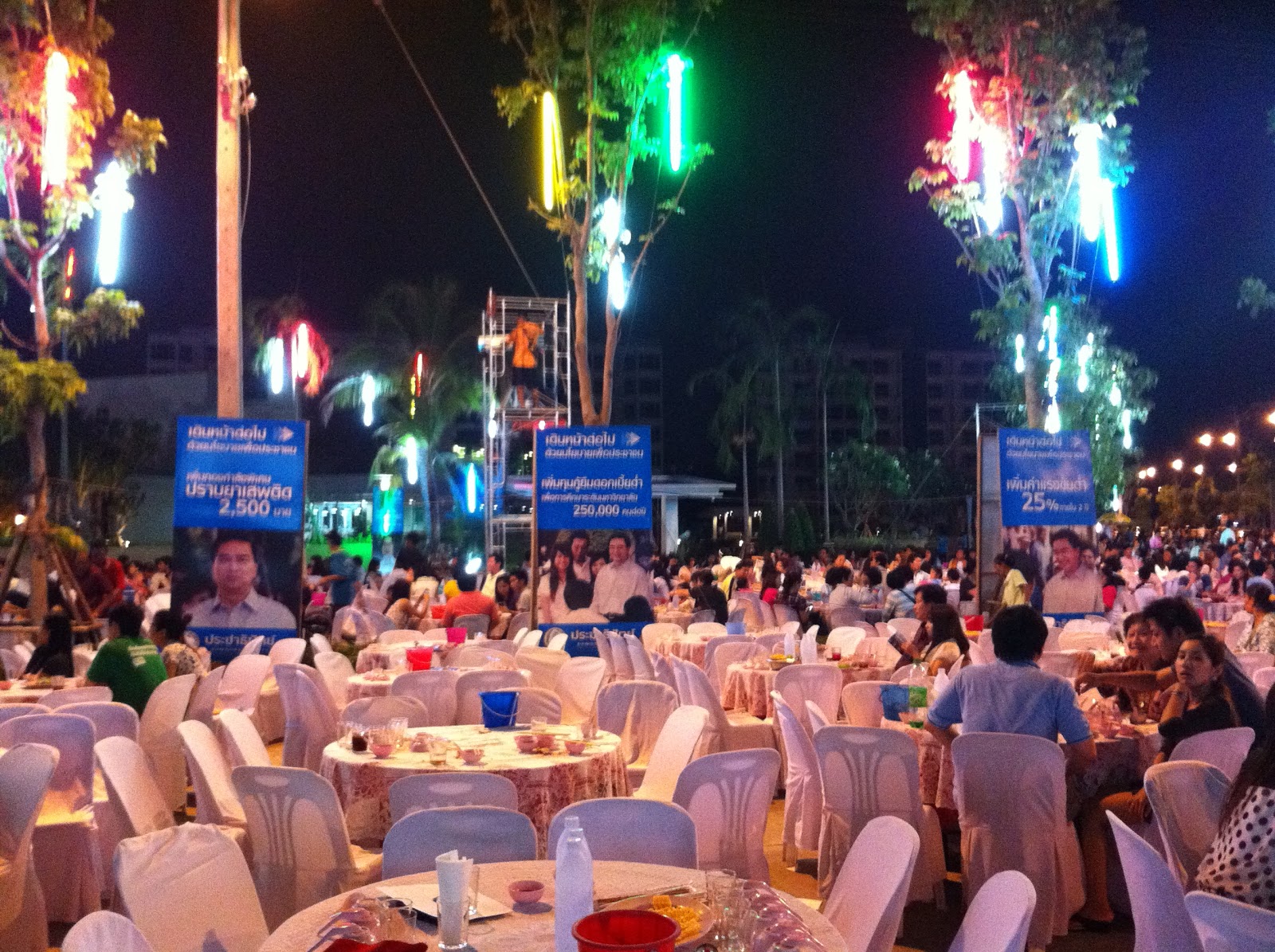 ผมมาถึงช่วงงานจะเลิกแล้ว ถามคนแถวนี้ได้ความว่าผู้ว่ากับนายกไม่ได้มา เพราะติดภาระกิจช่วยภาคใต้ เลยส่งสส. สว. สก. และสออะไรอีกก็ไม่รู้มากันเต็มเวที พูดนโยบายกันอยู่ชั่วโมงนึง หลังจากนั้นอาหารโต๊ะจีนจานแรกจึงเสิร์ฟ และต่อด้วยคอนเสิร์ตนักร้องบนเวที -_-“