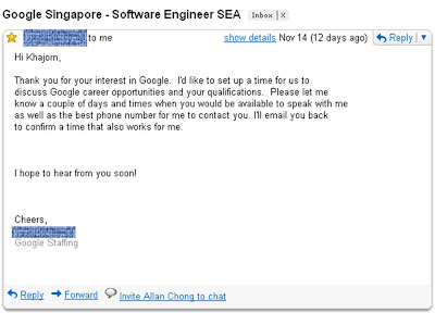 ไม่รู้จะอธิบายยังไงถึงความรู้สึกตื่นเต้นตอนที่ได้รับ .. อีเมล์ฉบับนี้ส่งมาจากแผนกบุคคลของกูเกิลที่สิงคโปร์ เนื้อความข้างในไม่ได้บอกรายละเอียดมากนัก เพียงขอให้เราส่งวันเวลาที่สะดวกเพื่อพูดคุยกัน แล้วทางกูเกิลจะส่งอีเมล์มาคอนเฟิร์มเวลาอีกที