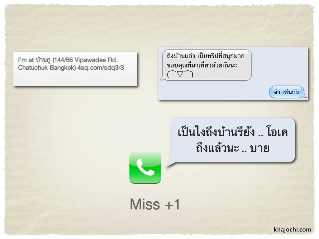 กลับมาจากทะเล แทนที่จะมา check in 4sq ว่าถึงบ้านแล้ว ทำไมไม่ลอง +1 SMS ข้อความน่ารักๆ ไปขอบคุณที่มาเที่ยวกัน หรือโทรไปถามว่ากลับถึงบ้านแล้วรึยัง พอรู้ว่าถึงบ้านแล้วก็วางเลยครับ แค่ถามด้วยความห่วงใย