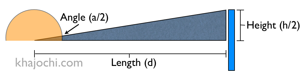 ถ้าตาคนเรามองไปที่กลางจอพอดี และแสงที่ตกกระทบกลับมาที่ตาตรงกลางพอดีเช่นกัน เราก็ควรจะตัดรูปข้างบนออกครึ่งหนึ่ง แล้วสร้างเป็นรูปเป็นสามเหลี่ยมมุมฉากดังภาพ