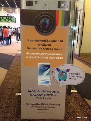 ลงทะเบียนเข้างานก่อนเพื่อลุ้นรับ iPhone5 และถ่ายภาพภายในงาน Sansiri Life Comes Home แล้วใส่ #Livinstagram และ #LCH2013 เพื่อลุ้นรับ Samsung Galxy Note II จำนวน 1 รางวัล และตุ๊กตา Furby 3 รางวัล น่าสนใจอีกแล้วครับ