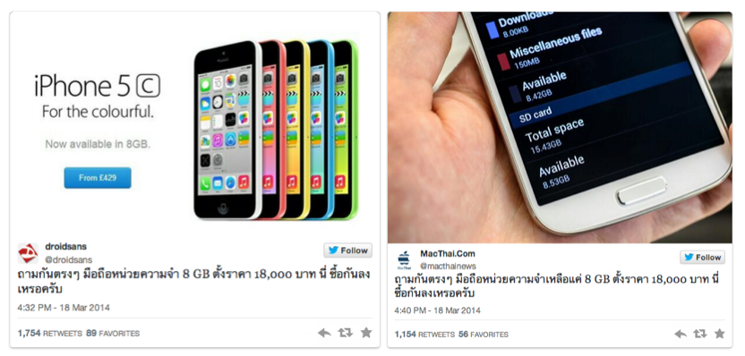 เมื่อเว็บเพื่อนบ้านสุดที่รักอย่าง DroidSans ทวีตแซะ iPhone 5c ที่ราคา 18,000 บาทให้เนื้อที่แค่ 8 GB ซื้อกันลงจริงๆ เหรอจ๊ะ … หลังจากนั้นไม่นาน ทาง @arjin แจ้งข่าวมาที่ผม เลยมีการจัดให้ MacThai ทวีตแซะกลับว่ามือถือที่มีเนื้อที่ใช้จริงแค่ 8GB ขาย 18,000 บาท เหมือนกันนะจ๊ะ จนเกิดไวรัลเล็กๆ