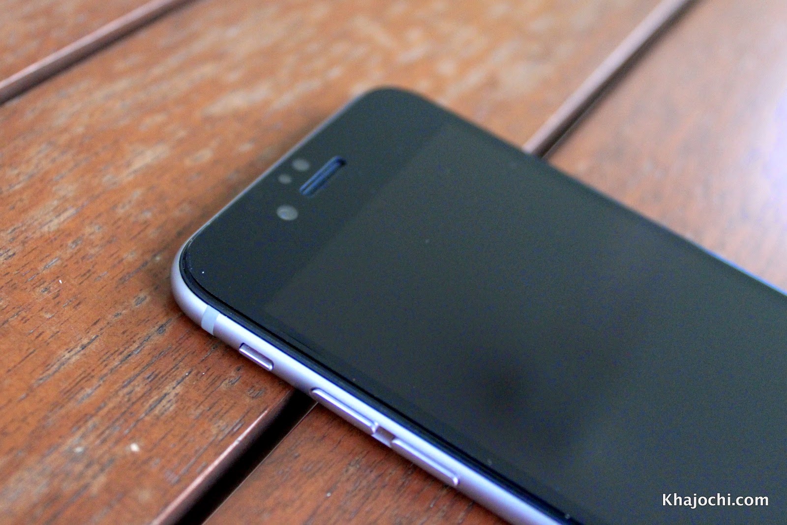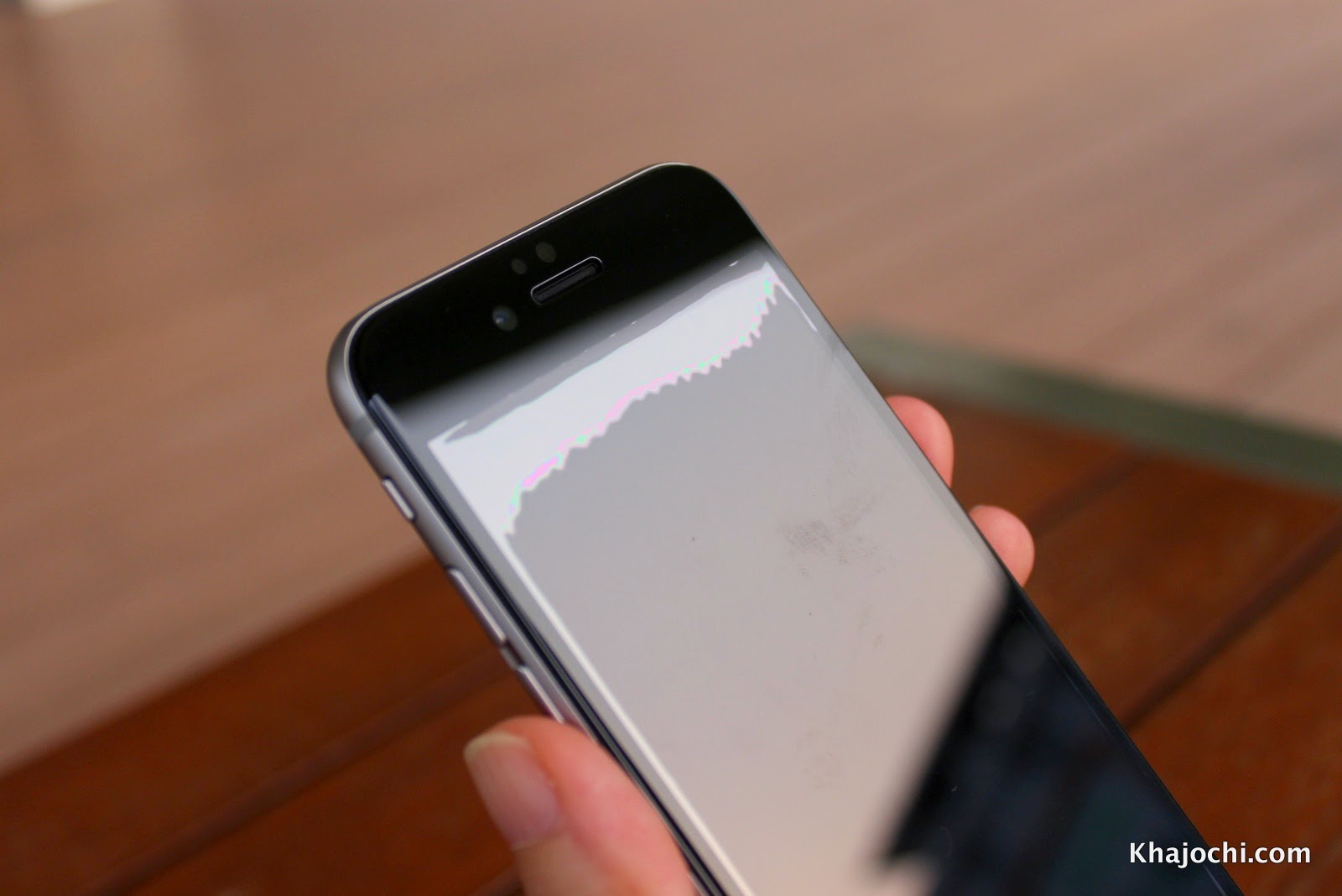 ติดเสร็จแล้ว พอลองดูแบบเต็มๆ ก็จะเห็นว่ารุ่น Blue Light Cut Tempered Glass จะติดไม่เต็มจอ อย่างที่หลายคนรู้ว่าจอ iPhone 6 เป็นแนวโค้งที่ขอบ ทำให้ติดได้เฉพาะส่วนสัมผัส