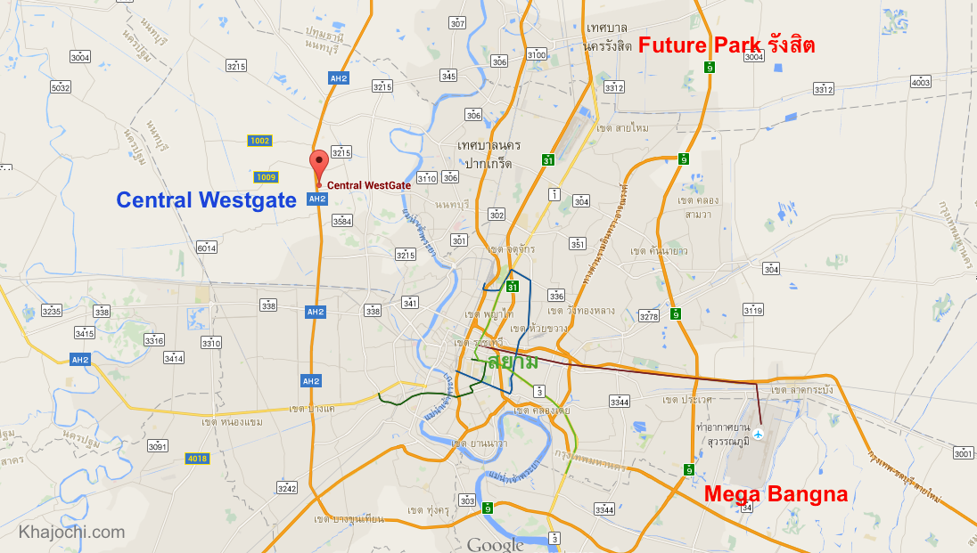 - ถ้าดูจาก Google Maps จะเห็นว่าห่างจากตัวเมืองมากพอสมควร ความห่างระดับเดียวกับ Future Park รังสิตหรือ Mega Bangna
